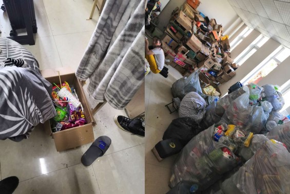 4.8栋宿舍清洁工物理堆放大量废旧衣物、棉絮和饮料瓶,存在消防安全隐患,并且在屋内使用大功率电器。
