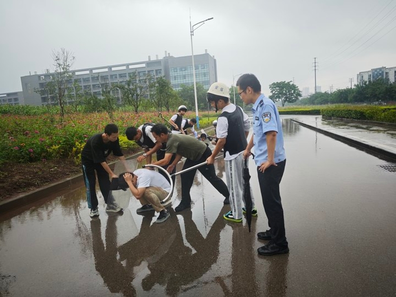 2025年6月18日下午,重庆电信职业学院在西门组织了一场紧张有序的反恐实战演练,参与此次演练的人员主要为学校治安服务队队员、保安队员,通桥派出所民警杨昊荣受邀前来协助,共同完成此次演练任务。